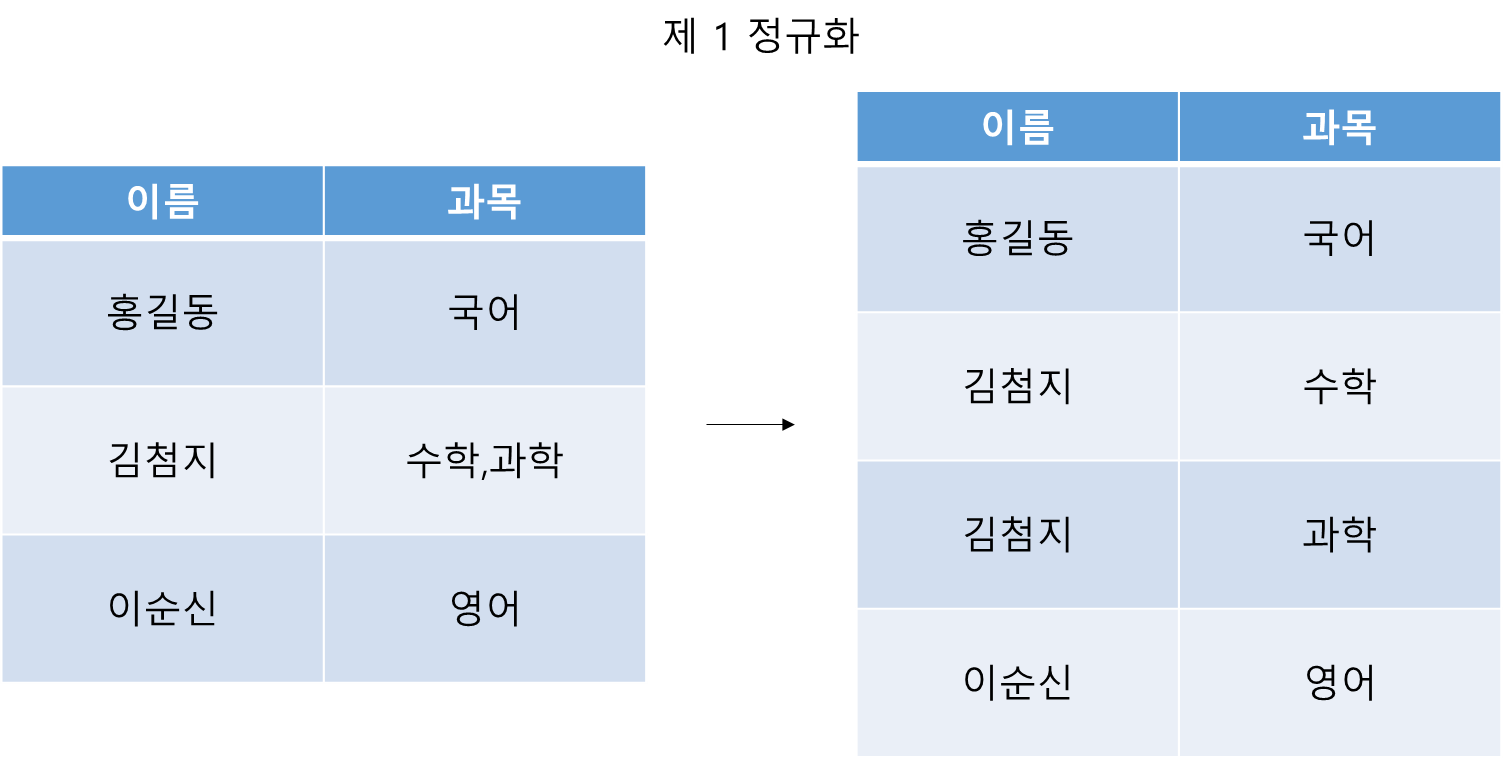 - 테이블의 컬럼이 원자값(Atomic Value)을 갖도록 테이블을 분해하는 것