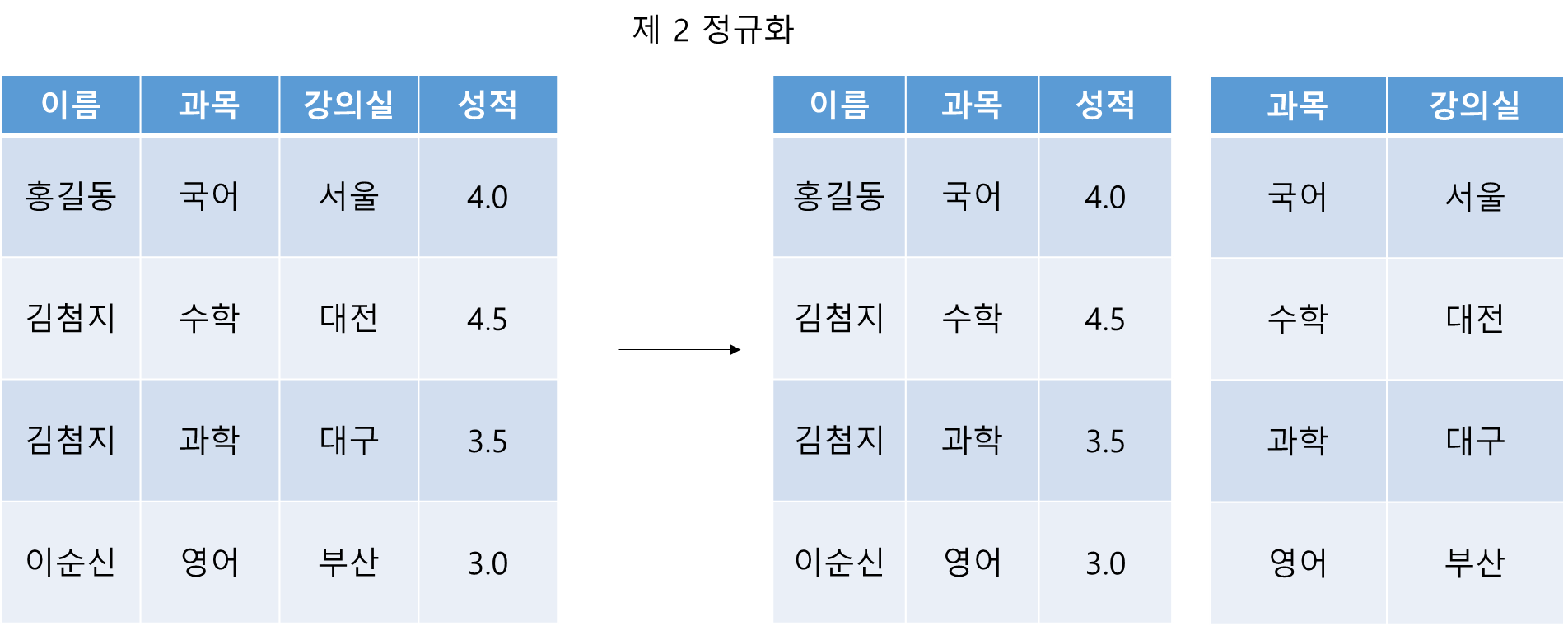 - 기본키의 부분키가 강의실의 결정자이므로 제 2정규화를 진행하면 오른쪽과 같이 제 2 정규형이 된다.