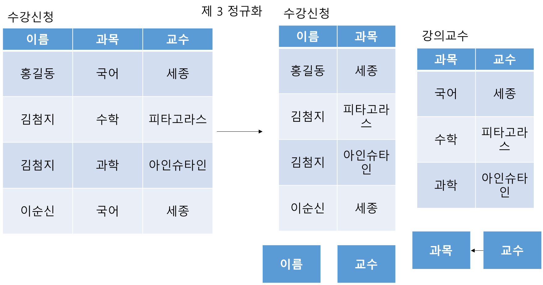 - 하지만 기본 테이블의 경우 과목으로 수용인원을 결정할 수 있기에 이행 함수 종속을 제거하므로 오른쪽과 같이 제 3 정규형을 만족할 수 있다.